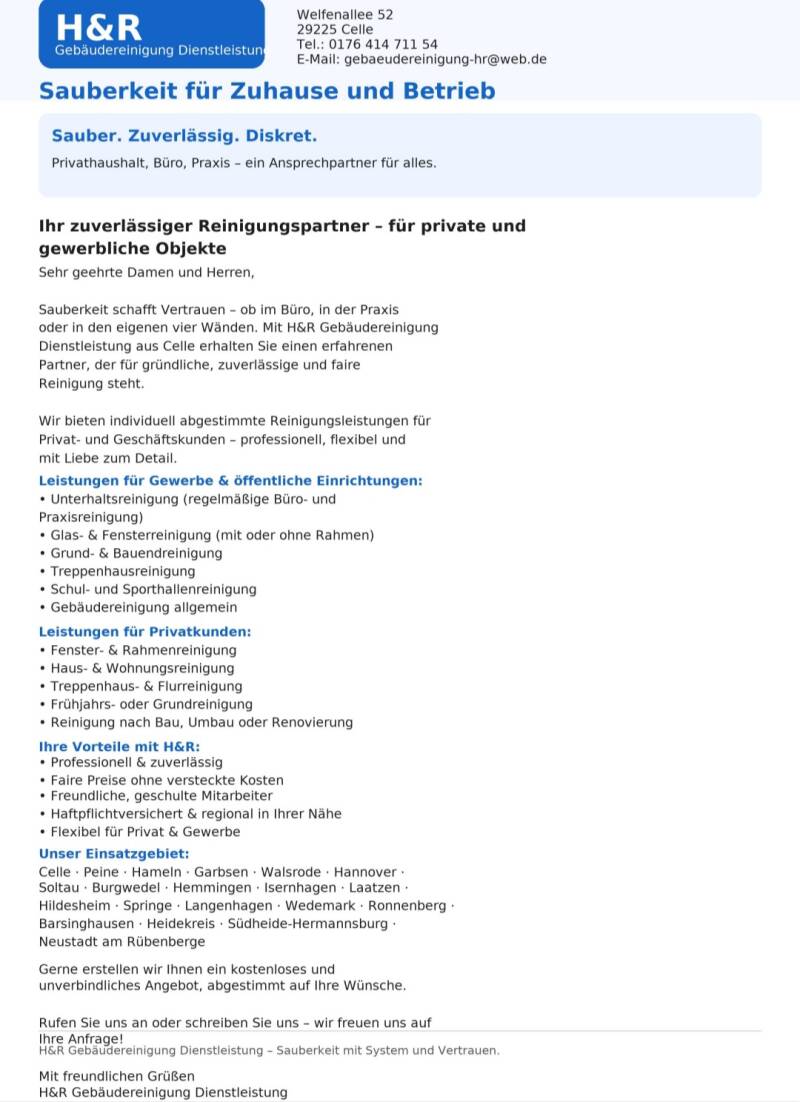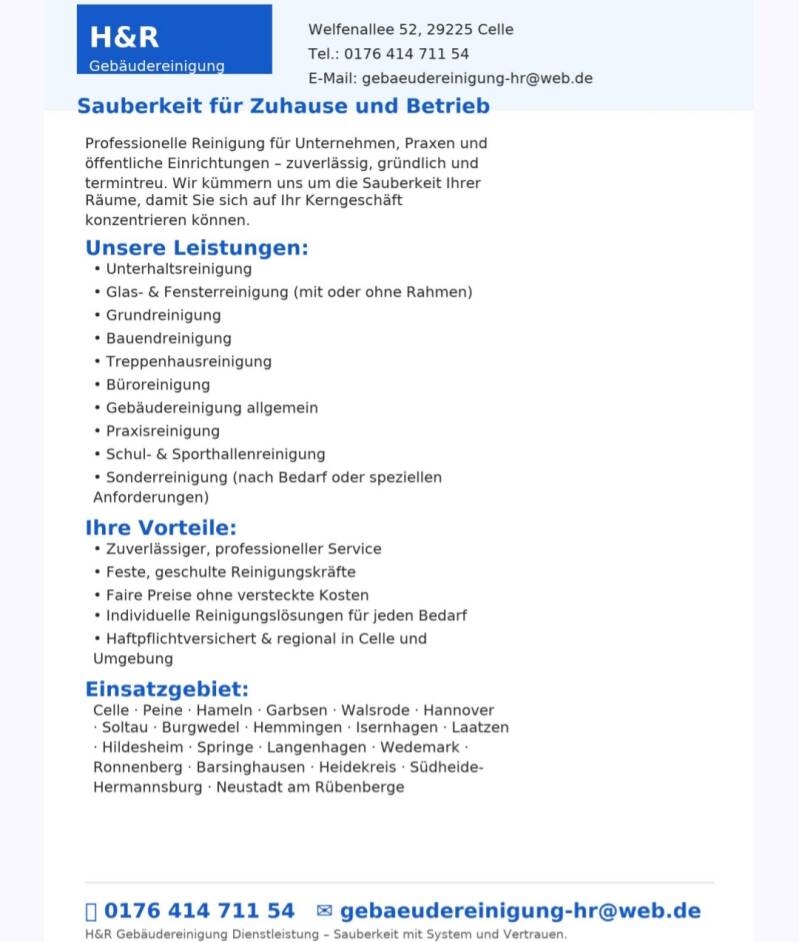 H&R gebäudereinigung ist ein führender Reinigungsdienst in Hanover, der sich durch Professionalität, Zuverlässigkeit und gründliche Arbeit auszeichnet. Unsere Kunden vertrauen auf unsere Expertise und schätzen unseren hohen Qualitätsanspruch.